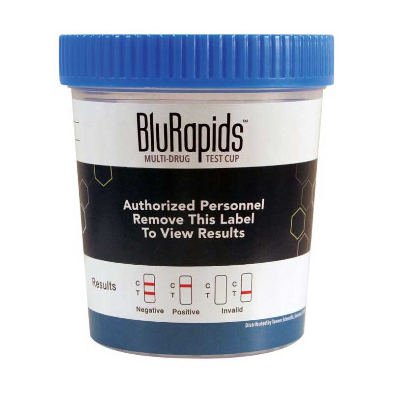The Tanner Scientific® BluRapids® 12-Panel Drug Test Cup provides rapid results for 6 substances: AMP1000, BAR300, BUP10, BZO300, COC300, MDMA500, MET1000, MTD300, OPI300, OXY100, PCP25, TCA1000, NO THC, CLIA Waived (25/Box).